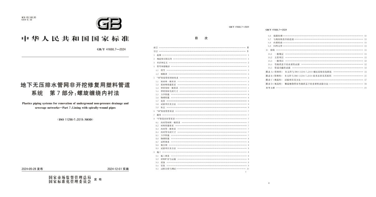 國家標準《地下無壓排水管網非開挖修復用塑料管道系統 第7部分:螺旋纏繞內襯法》 GB/T 41666.7-2024 正式發布是由中國輕工業聯合會提出,全國塑料制品標準化技術委員會(SAC/TC48)歸口。于2024年5月28日批準發布,實施日期為2024年12月1日。